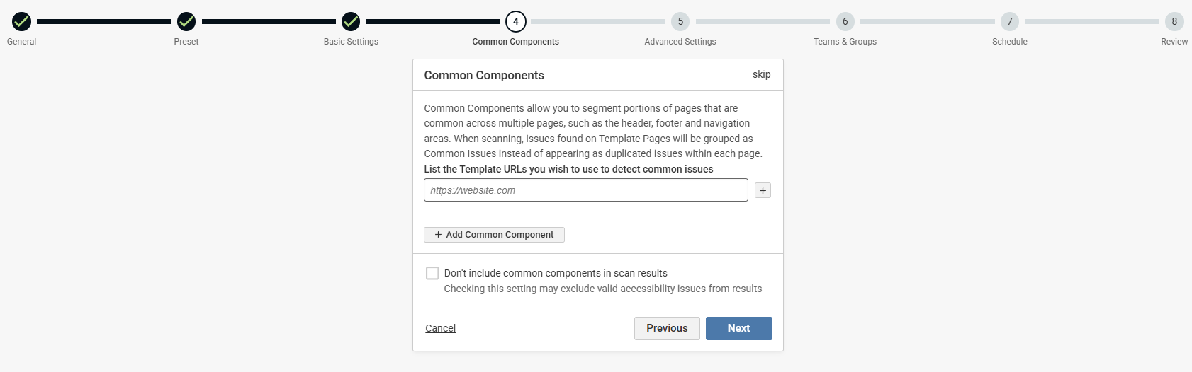 Note: If you do not want to include common components (for example header or footer content), in the scan results, enable the “Do not include common components in scan results” checkbox.