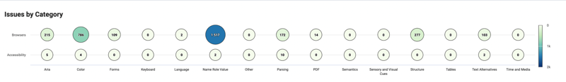 This Bubble Chart provides a view into the total number of accessibility violations found within the selected hierarchy level by Fifteen (15) actionable categories. The categories are (alphabetical order):
