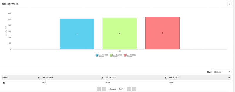 This chart captures how your issues are trending with the total number of accessibility issues rolling up to the period you've selected. The default period is Issues by Month, and the chart represents each month in your selected start and end dates if data exists for that period. If you selected 'Week' or 'Day' in the roll up selection, the chart filters the data to reflect your selection and renames the chart accordingly.