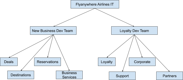 Consider, for example, an organization named Flyanywhere Airlines organized as shown below: