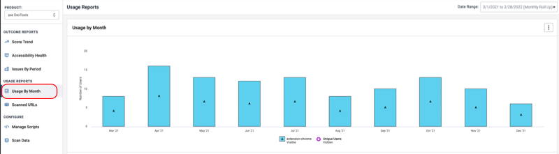 You use the Usage by Month chart to know the usage of Deque products and components for the selected dates based on departments or product components. This helps determine the number of users using the provided Deque products, and also know the departments and components being used.