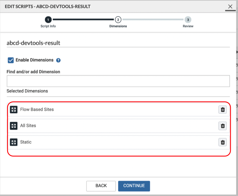 Note: You can create a maximum of six dimensions per script. The dimension name can only be up to forty characters long.