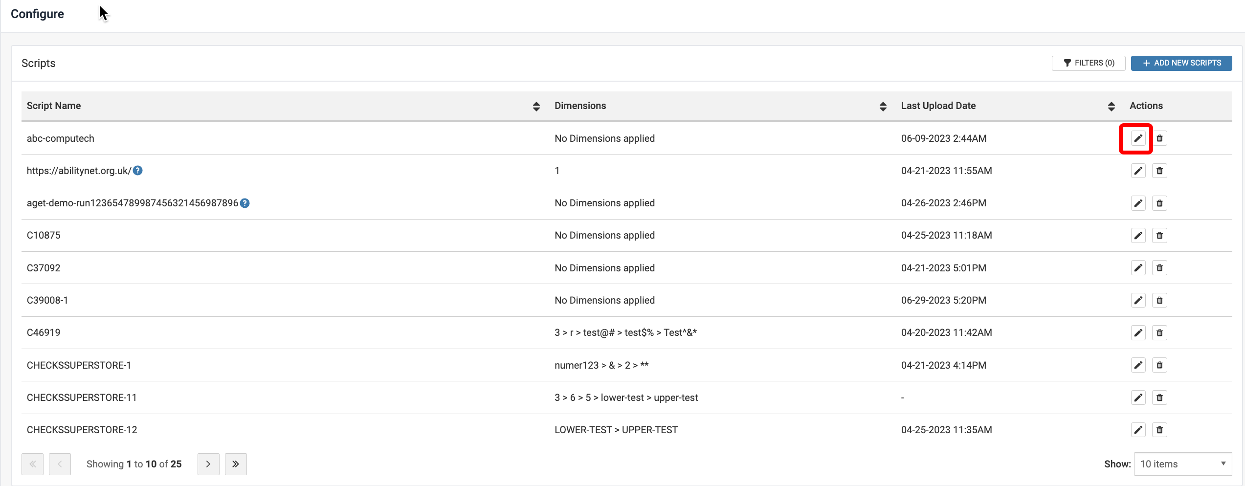 Activate the Pencil icon under Actions column on the table for the Script you want to edit the dimensions for.
