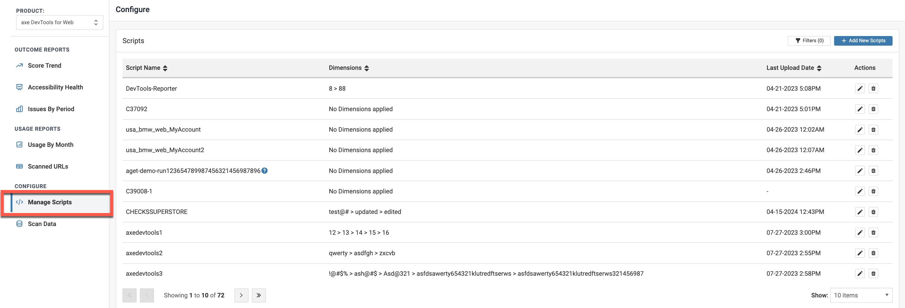 This brings up the Scripts screen. The display name appears under the Scripts Name column with the help icon next to the name. Hover over the icon to display the axe DevTools® for Web script name.