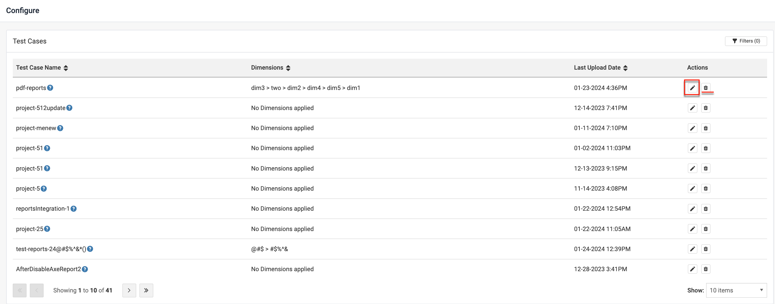- In the Configure screen that appears, activate the 'Edit' button (Pencil icon) under Actions column on the table for the test case you want to enable the dimensions for.
