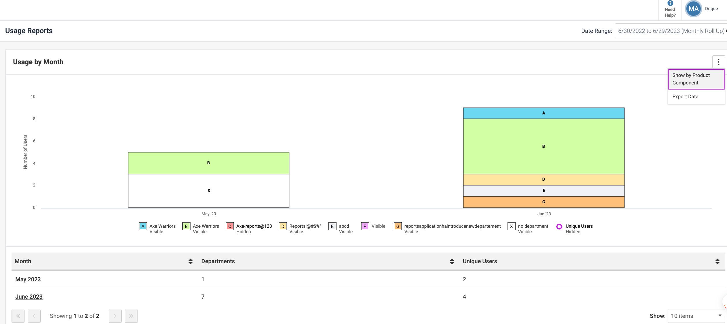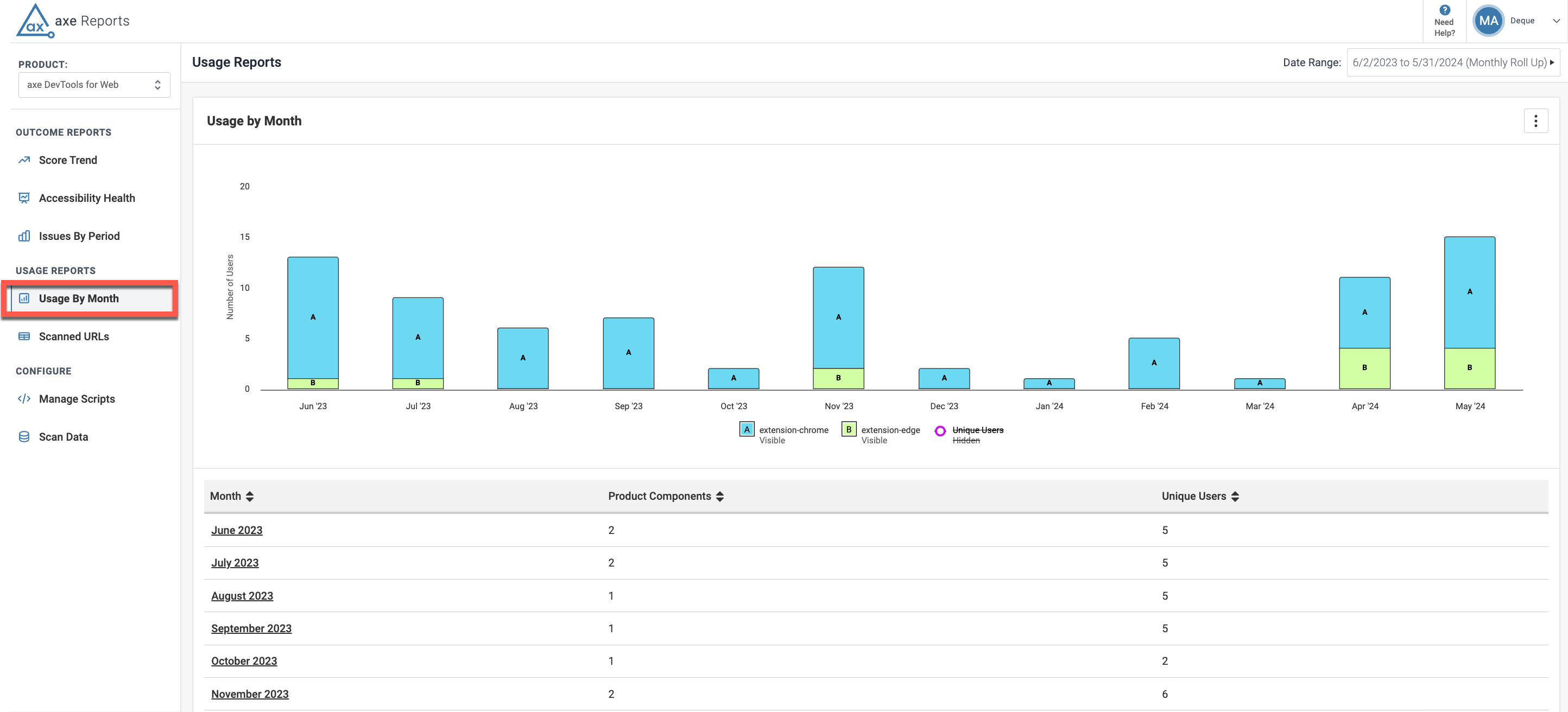 You use the Usage by Month chart to know the usage of Deque products and components for the selected dates based on departments or product components. This helps determine the number of users using the provided Deque products, and also know the departments and components being used.
