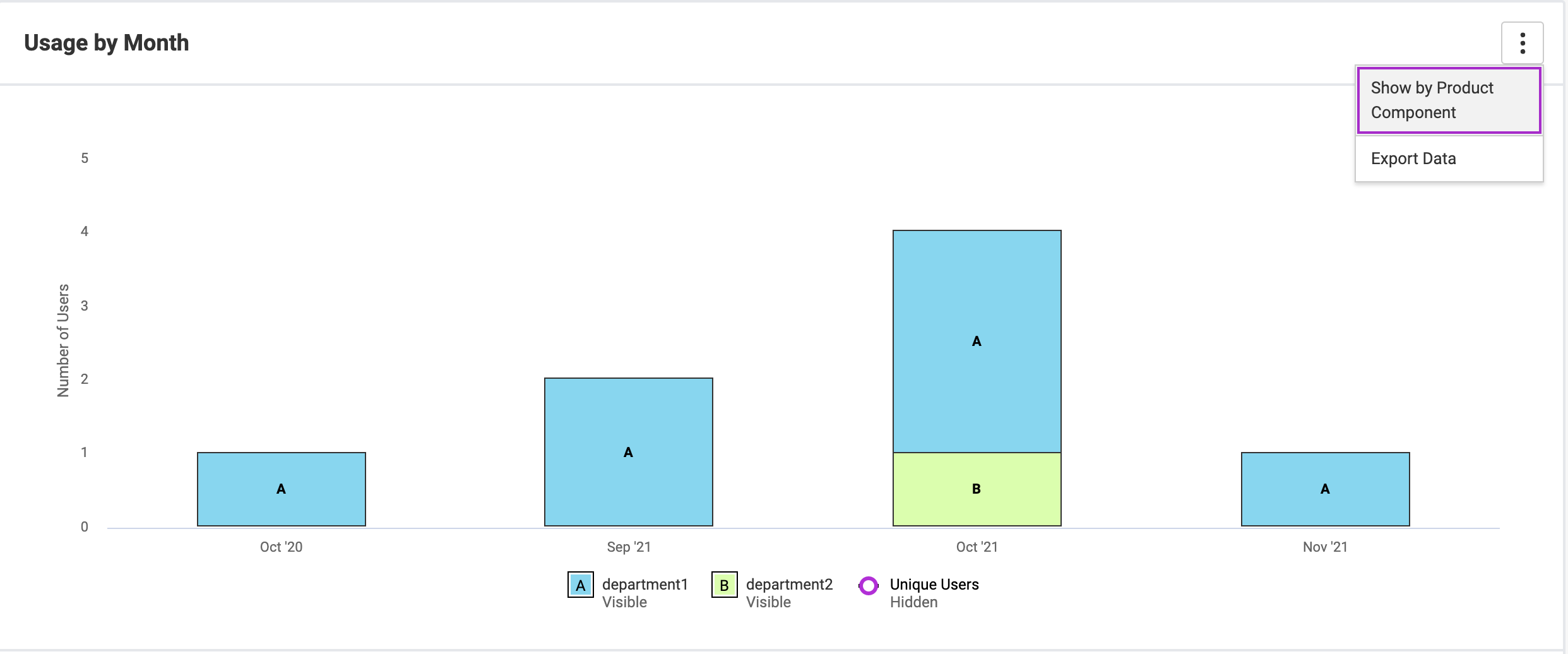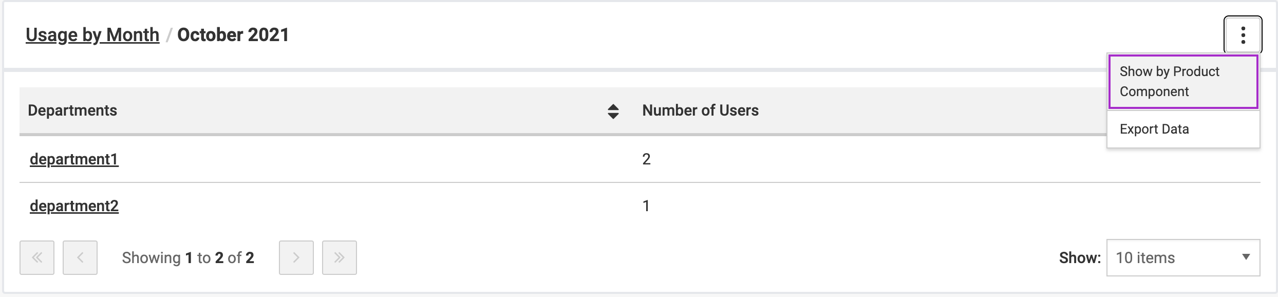 To select reporting based on department, use the vertical ellipsis icon and select the toggle option Show by Department. For usage data without any department entry, the department section displays No Department.