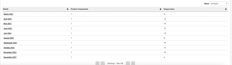 In the Data Table view, the Usage by Month chart displays the data in a Data table with product components and unique users for each month. Activating the month drills down into further detailed levels with product component, user, and scan data details.