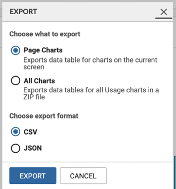 All Charts: Select this radio button if you want to export the data table for all usage charts in a ZIP file.