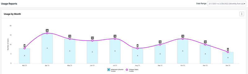 The Usage by Month data displays the comparison for the last three scans (periods) before the end date and after the scan date. Select these dates, the date period, and the roll up frequency from the Date Range dropdown menu on the top right of the screen.