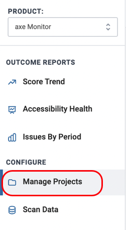 Select the Manage Projects option from under the Configure section on the left hand corner of the screen.