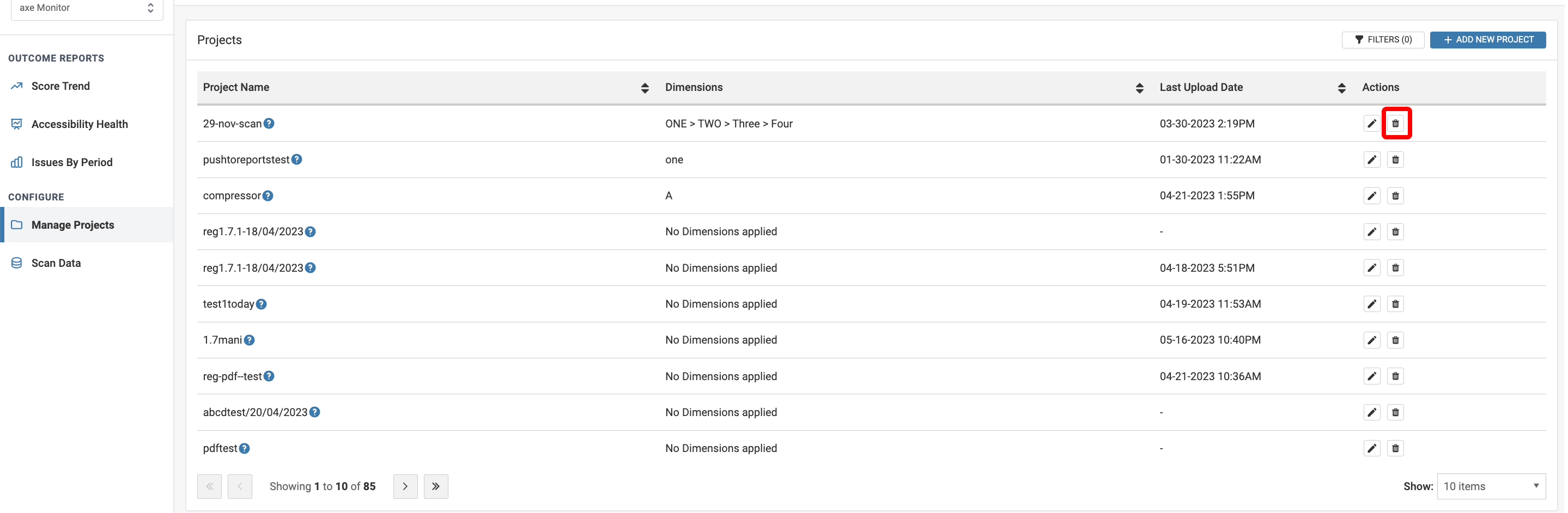 In the Configure Projects screen that appears, to delete the project from the configured projects, click the Delete button (bin icon) under Actions column on the table for the project you want to delete.