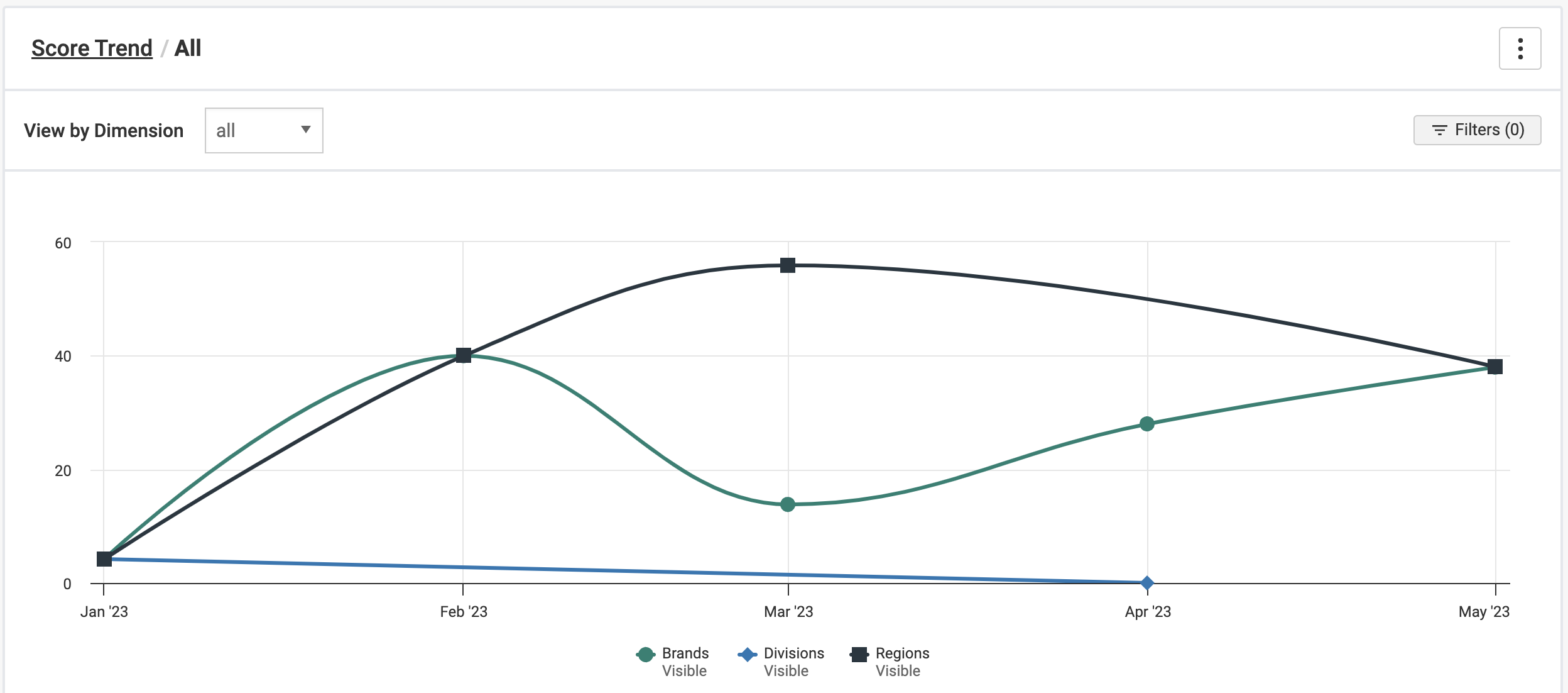 To compare accessibility across your Divisions, select View By from the chart dropdown. Select a point on the chart or table to continue drilling into your desired hierarchy. You may notice that certain divisions are improving faster than others. You can use this information to learn from the successful divisions at your company. Or, you can use this comparison to understand which divisions need more focused attention on accessibility.