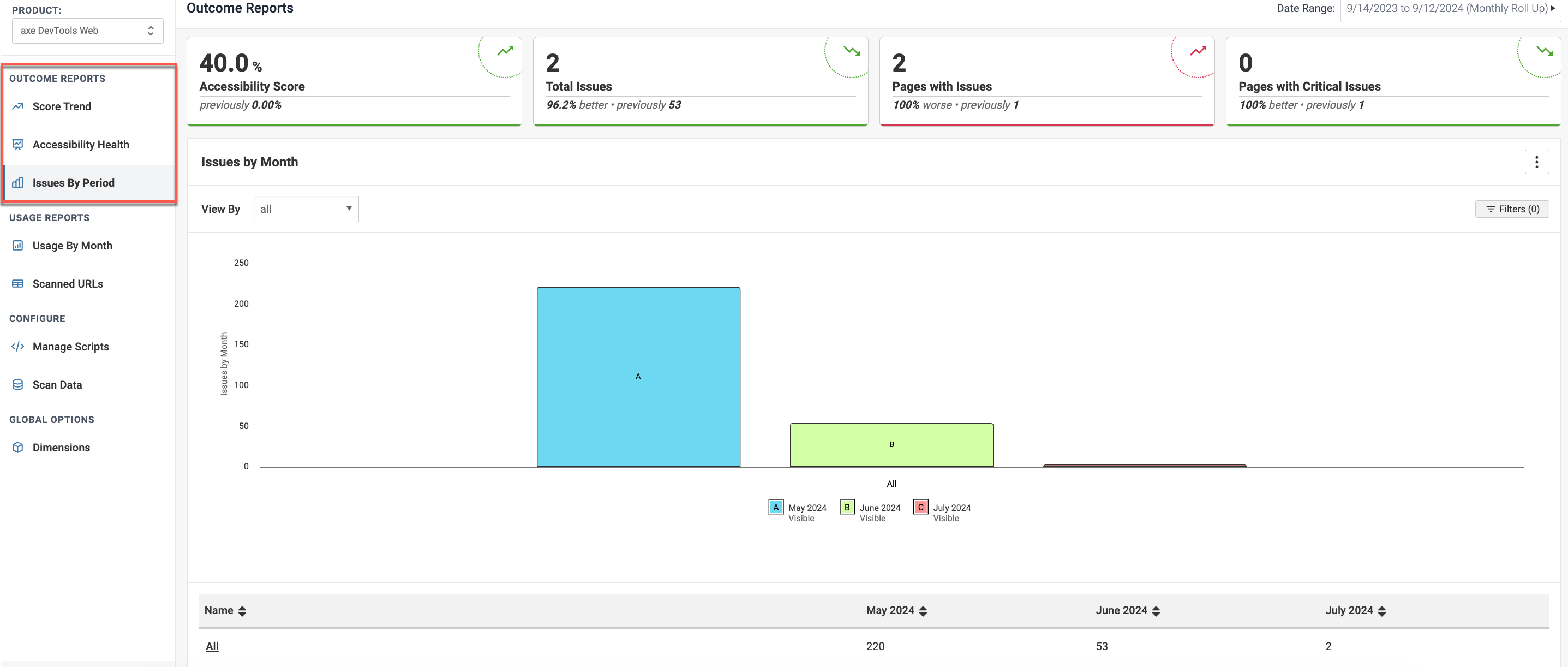 Outcome Reports comprise of two sections: Charts and Key Performance Indicators. There are three subtopics in this section that comprise instructions on how to work with the three different charts in axe Reports that essentially help you navigate around and use the charts in axe Reports most effectively.